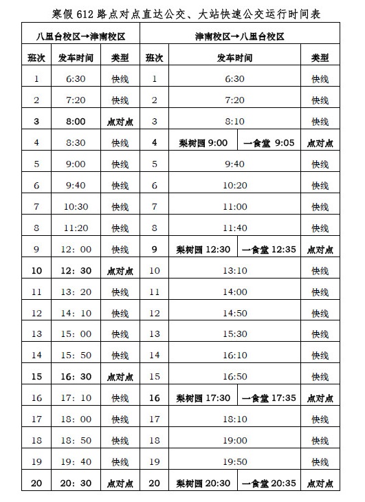 1月22日至2月14日(含周六、日及法定节假日)实行寒假运行方案。在612路点对点直达公交和大站快速公交运行间隙,根据实际需求安排普线公交;寒假期间,点对点直达公交、大站快速公交、普线公交运行线路及停靠站点不变;津南校区225路校园公交停运;2月15日612路点对点直达公交、大站快速公交、普线公交及225路校园公交恢复正常运行模式,其中2月16日、17日(周六、日)按工作日方案运行。