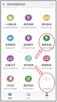 扫描beat365中文官方网站企业号二维码或在微信中搜索“南开企业号”并关注,之后通过“身份验证助手”绑定信息门户账号。进入“南开微应用”,选择列表中的“电表充值”应用,若列表中没有出现该应用,可进入下方的“所有应用”中选择添加。