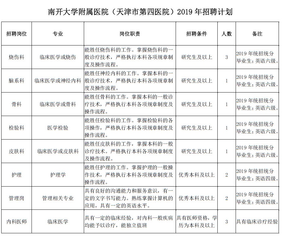 我单位于2019年3月28日,在单位网站(fy.nankai.edu.cn)及卫生人才网站(www.TJWSRC.)、我单位微信公众号(nkdxfsyy)发布招聘公告和招聘计划。