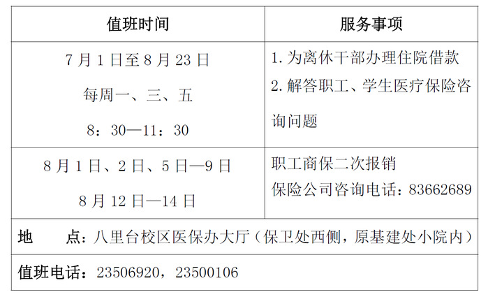 2019年暑假期间,医保办继续为师生提供医疗保险咨询等相关服务,具体安排: