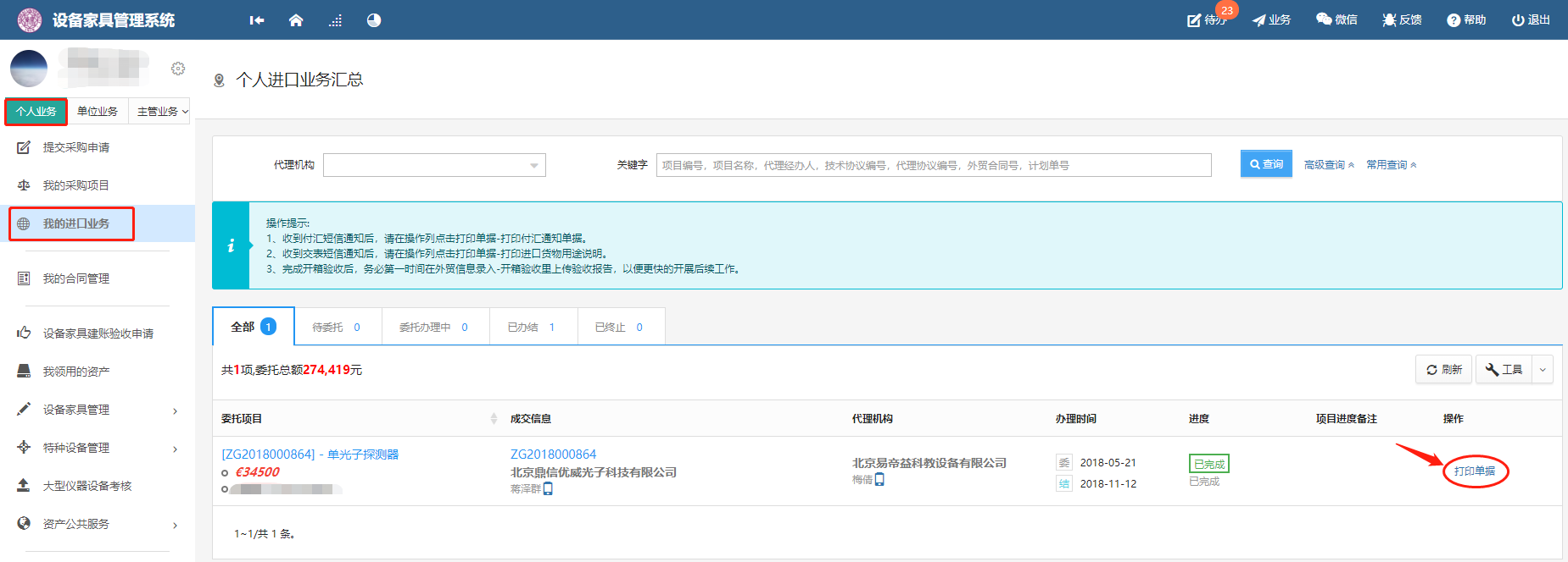 进口设备采购:在设备家具管理系统个人业务”中“我的进口业务”页面,已审核通过的设备最右侧操作栏会显示蓝色的“打印单据”,点击该链接后,可以在后续打开的页面中,打印出《beat365中文官方网站进口设备预付汇款通知》(操作说明见附件2)。持该通知和财务处e系统打印的借款单即可前往财务处投递借款,无需再到实验室设备处加盖借款章。