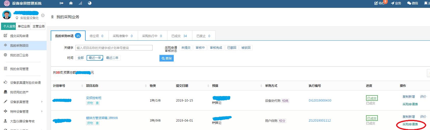国内设备及家具采购:在设备家具管理系统个人业务”中“我的采购项目”页面,已审核通过的设备家具最右侧操作栏会显示蓝色的“采购申请表”,点击该链接后,可以在后续打开的页面中,打印出《beat365中文官方网站采购申请表》(操作说明见附件1)。持该申请表和财务处e系统打印的借款单即可前往财务处投递借款,无需再到实验室设备处加盖借款章。