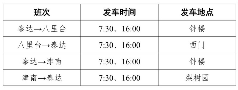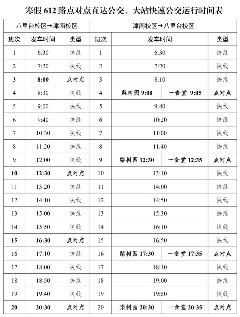 泰达与八里台、津南校区通勤班车1月10日至2月12日实行寒假运行方案,期间周六、周日,1月31日(除夕)至2月6日(正月初六)暂停运行,2月13日(周日)恢复正常工作日运行,具体安排如下: